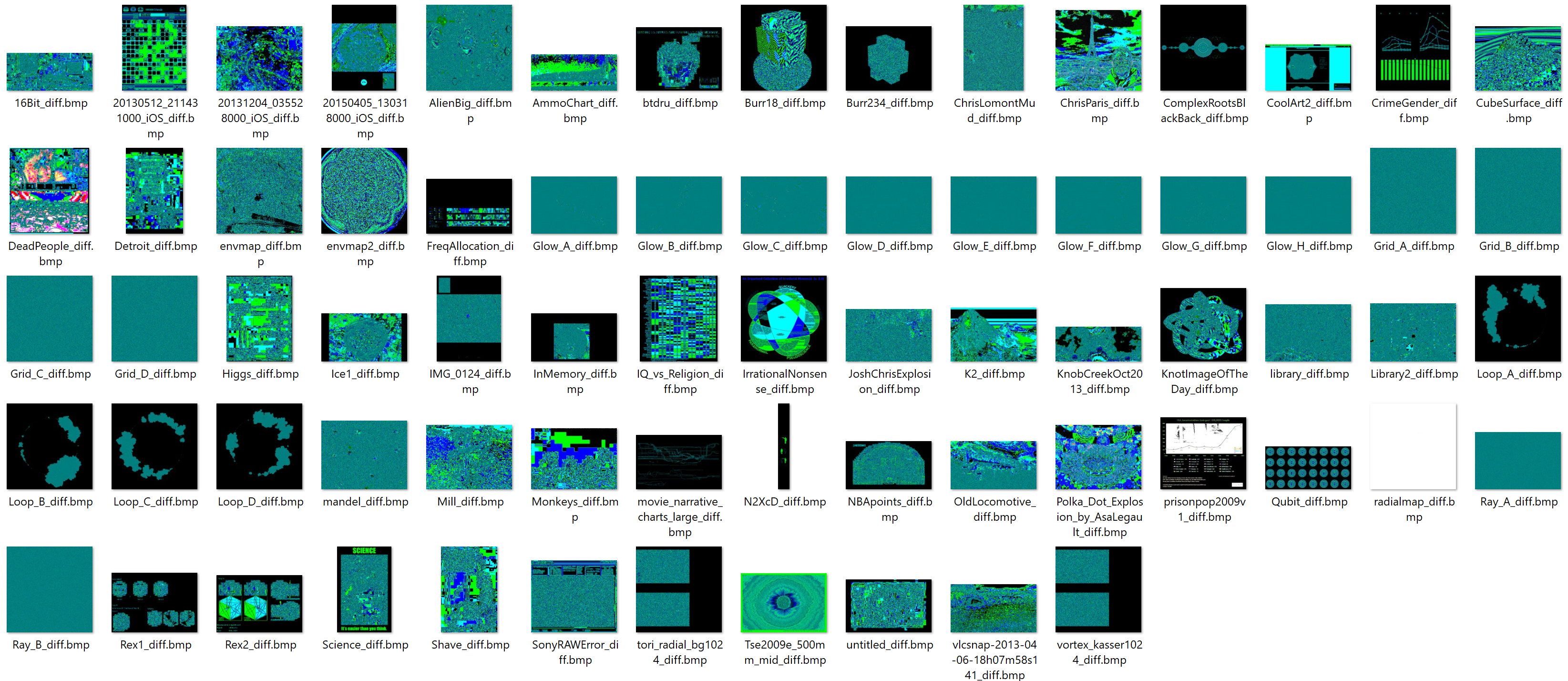 The simple tool (C#, here) that parsed the original and retrieved images, tallied all error pixels, sampled 500,000 errors, created diff images, and looked for anomalies.